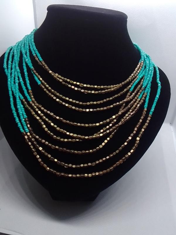 Кольє з бісеру доповнено квадратними намистинами, довжина 44+8 см
