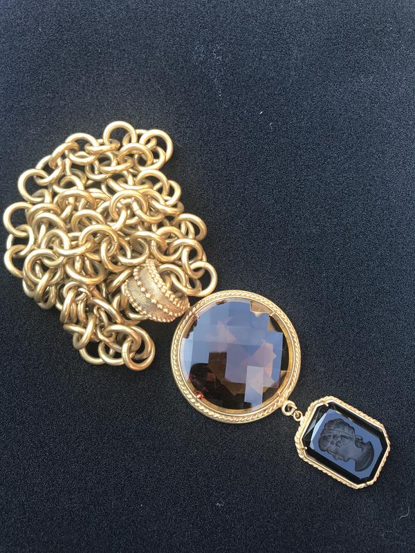Ланцюг з каскадом підвісок. Чудове історичне прикраса. Створено як ріпка на прикраси Венеціанських Дожів. Бренд PATRIZIA DALIANA Ручна робота. Ланцюг - метал повновага бронза. Інтарсія - гірський кришталь кольору Амбра (медово золотий), оправа бронза. Виготовлено у Флоренції, Італія