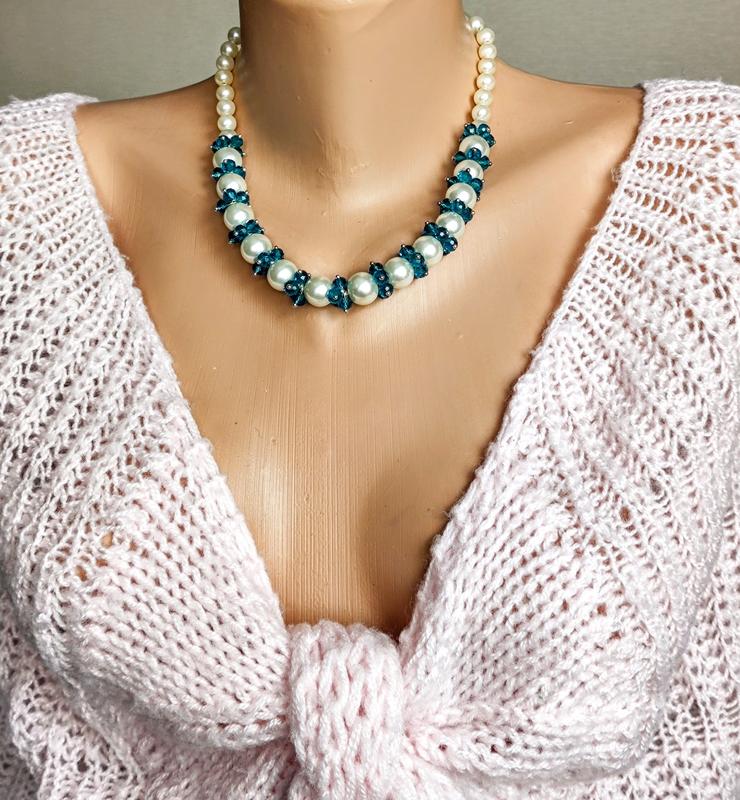 Кольє 'Вечірнє-2' зібране з 'перлів' 10 і 7 мм (якісна імітація - скло) і кристалів 4х6 мм синього кольору (відтінка 'циан') на надійному металевому ювелірному тросику. Металева фурнітура кольору срібла. Довжина - 46 см плюс 5 см подовжувальний ланцюжок. Прикраса має святковий вигляд і пасує до вечірнього вбрання. Кольє ексклюзивне, створене в єдиному екземплярі. Передоплата на картку Приват банку. Доставка Новою поштою або Укрпоштою за рахунок покупця.