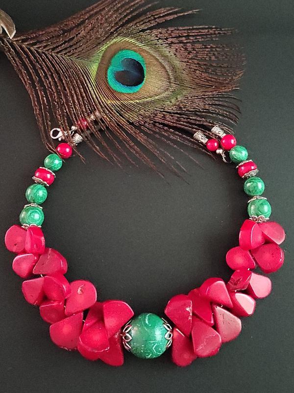 Червоний корал,малахіт ( имит.), фурнітура металева кольору античного срібла, довжина чокера 48 див. До чокеру можна замовити і купити браслет і сережки.(Фото комплекту для прикладу).Зверніть увагу на те що колір виробу, може відрізнятися від фото на сайті це залежить від налаштувань Вашого і мого монітора.