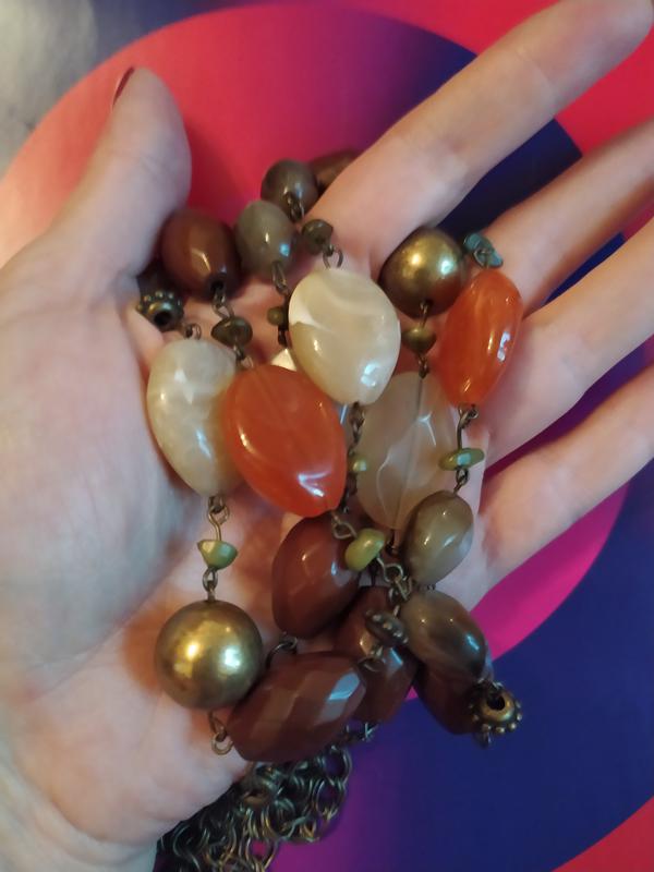 Намисто люцит, гранований пластик, крихта натурального каміння. На круглих золотистих намистинах мало помітні сліди шкарпетки. Довгі. бо