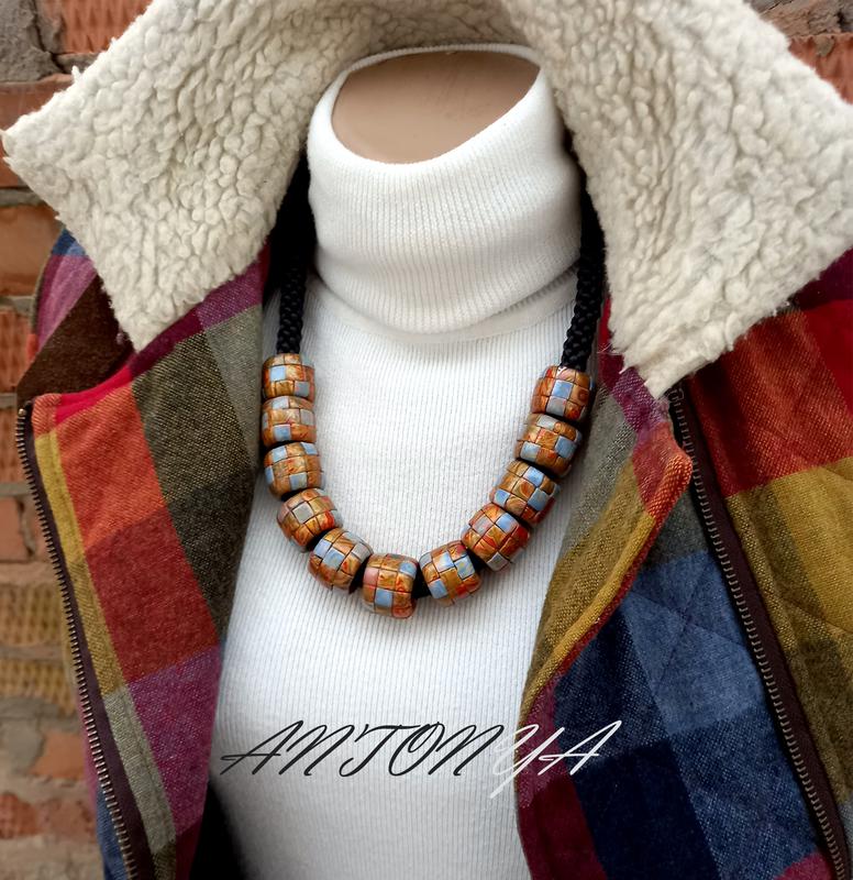 Колье выполнено из запекаемой полимерной глины в Этническом стиле, изделие прочное и не боится воды. Цветовая гамма колье в сдержанных золотисто-голубых оттенках, сочетается с любым цветом одежды. !!!! Длина колье 51 см, плюс удлинительная цепочка 5 см. Колье собрано на шнуре кумихимо ручной работы. Колье -Оригинальный и стильный подарок любимой девушке, жене, подруге, сестре на день рождения, на годовщину свадьбы, на юбилей, на 8 марта. Необычный подарок, дизайнерское украшение, эксклюзивный подарок, авторское украшение.