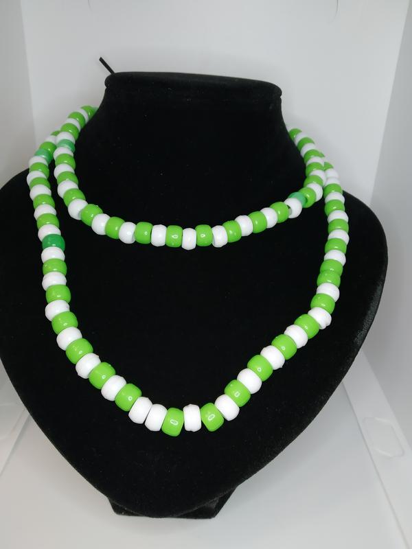 жіноче намисто з довгих пластикових бус без застібки. намистини у формі кілець зеленого і білого кольору висота виробу 44 см