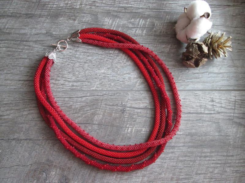 Багаторядне кольє з бісерних джгутиків. Кілька відтінків червоного. Довжина - 57 див.