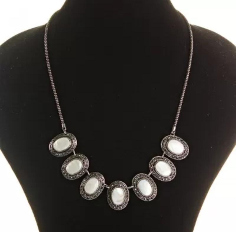 Кольє з Перламутром в металі під крапельне срібло, 7 овальних вставок 10*15, довжина 50см