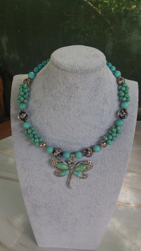 Кольє зібране із скляних намистин та намистин говліту. Фурнітура під срібло. Довжина кольє по колу 42 див.