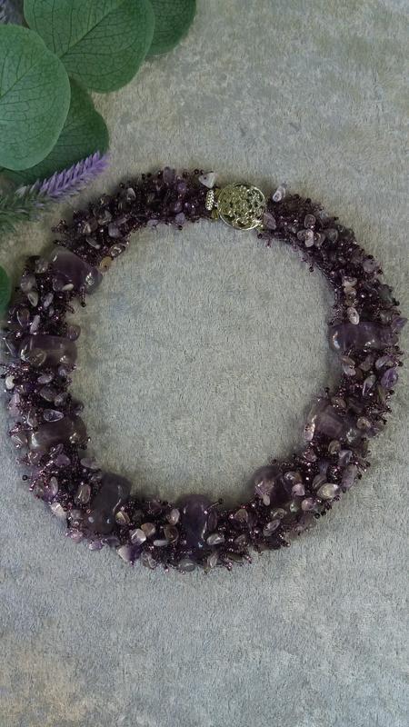 Кольє виготовлене із чеського бісеру, намистин та крихти аметисту. Фурнітура під срібло. Втутрішній розмір кольє 45 див.