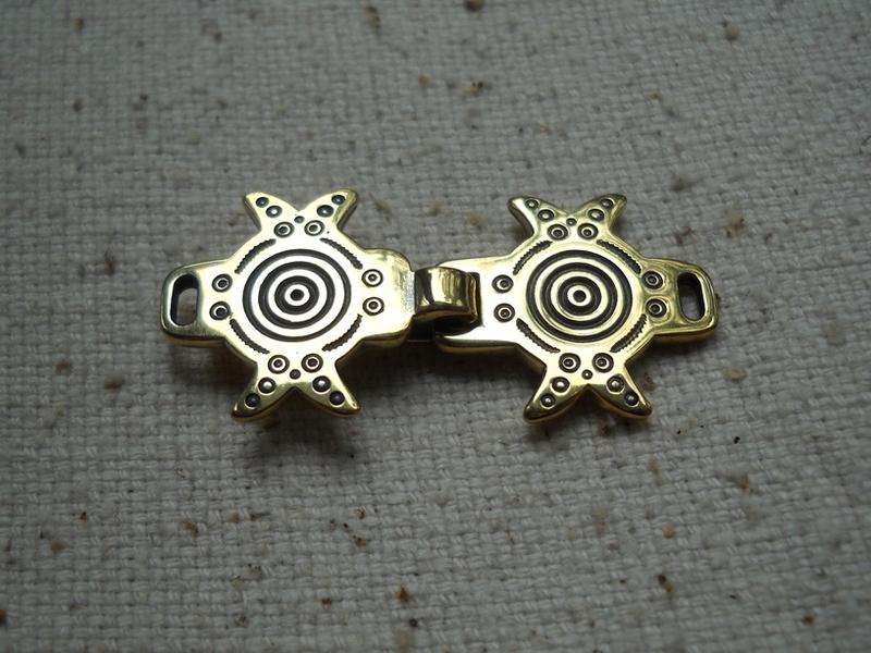 Традиційна гуцульська оздоба-оберіг, застібка для зґард. З давніх часів вважалося, що зґарди є символом єднання чотирьох земних стихій: землі і вогню, повітря і води. Також символ розкриває взаємозв'зв'язок часу і простору, енергії та інформації. застібка для зґард, намиста, коралів. Латунь, ліття, гравірування. 37x17 мм