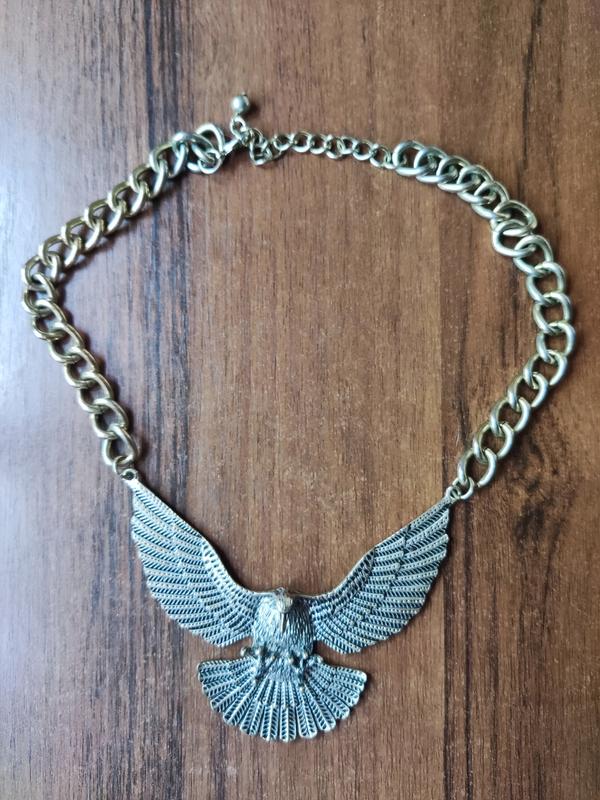 Важке, брутальне кольє з фігурою птаха, найшвидше хижого. Яскравий аксесуар для створення образу. Птах 11х8 см, бокові частини по 17 см + 7 см розширення