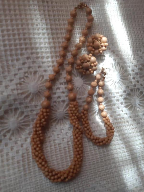 Намисто, браслет і кліпси. Без пошкоджень. В чудовому стані. Швидше за все, пластмаса довжина бусі 43-44 браслет 20 кліпси 2,5х2,5 вибачте, але у зв,язку з різким підвищенням сайтом % за продажі промов, торгу більше немає