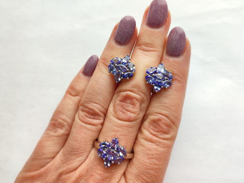 Танзанит - камень роскоши и процветания! Серебряный комплект с натуральными танзанитами: серьги и кольцо. Серьги: размер поверхности 15*12 мм, размер камней 5*3 мм. Вес 4,15 г. Кольцо: размер поверхности 15*12 мм, размер камней 5*3 мм. Вес 2,76 г. Серебро 925 пробы, покрытие 14 К белое золото. Производитель Таиланд. Размер кольца - 17,8.