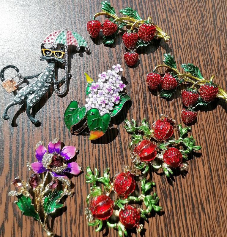 Красотки, если Вы следите за модой, то наверняка заметили, что в последние годы броши как никогда в тренде🚀💣👠💯👍 Ведь брошь – это аксессуар вне времени. С помощью этого украшения можно подчеркнуть собственную индивидуальность и мгновенно добавить шик всему, куда бы Вы её не прикололи 👍💓 Любая брошь 125 грн. Можно набором. Всех осталось по одной. Замеры: Брошь гранат: 4,1 см х 4,8 см Брошь земляника: 3,8 см х 5,4 см Брошь цветок: 5,7 см х 4,1 см Брошь сирень: 5,3 см х 3,3 см Брошь стильная кошка: 7,1 см х 4,8 см Если нужны дополнительно фото сделаю. Отвечу на любые вопросы 🤗👍 Отправлю любой почтой. Приглашаю Вас в свою шафу ❣️ Много брендовых вещей по низким ценам