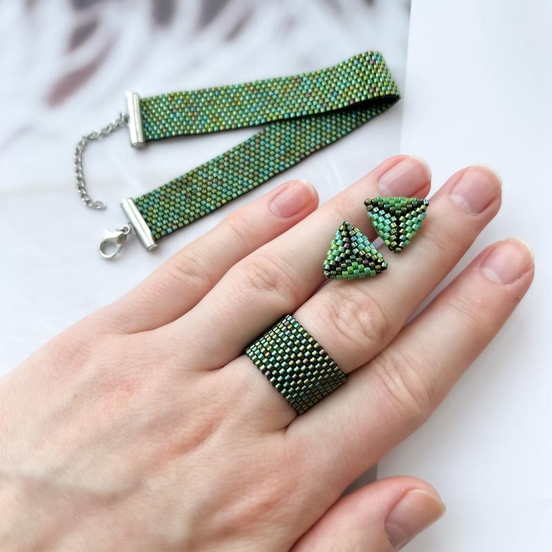 Через різну яскравість, роздільну здатність екрана, колір товару на фото може трохи відрізнятись від фактичного. Всі заміри товарів робляться вручну, тому допустимо незначне відхилення розміру. Дякуємо за розуміння! Прикраси виготовлені з японського бісеру Miyuki Delica Довжина браслета ~16 см + 1,5 см фурнітура +4 см подовжувач Ширина ~ 13 мм Ширина кільця 13 мм Розмір сережки - 15*15 мм Повністю ручна робота Виготовляємо будь-який розмір колечка