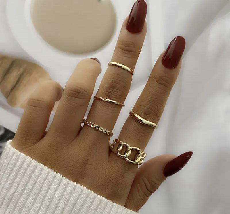 В наборе пять топовых моделей колечек, часть с регулируемым размером, часть кольца фаланги. Цвет: серебро и золото. Состав: бижутерный сплав. Цена 100 грн.