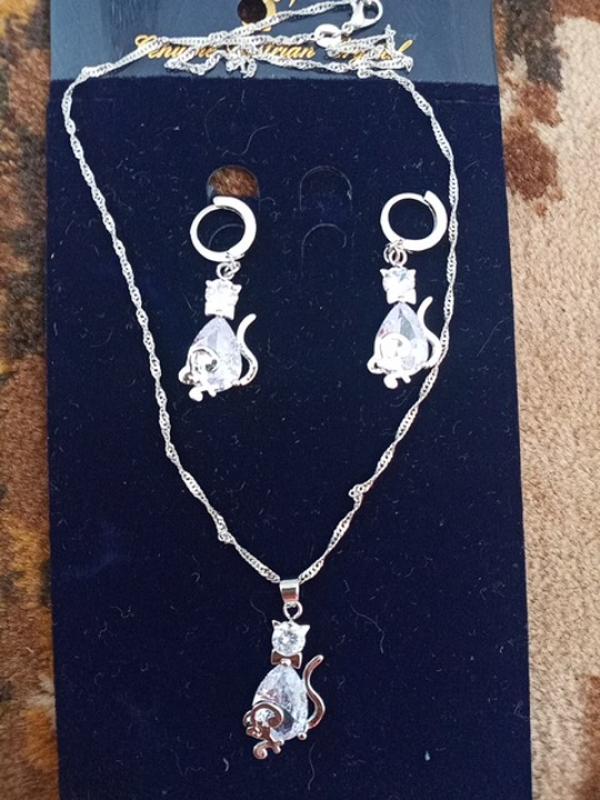 Шикарний посрібний набор, в евростилі, з трьох елементів, проби є, камінь - кришталь, якість висока! Довжина ланцюжка 45см, висота кішки - 2см, з кріпленням - 3.5см. Рекомендую!