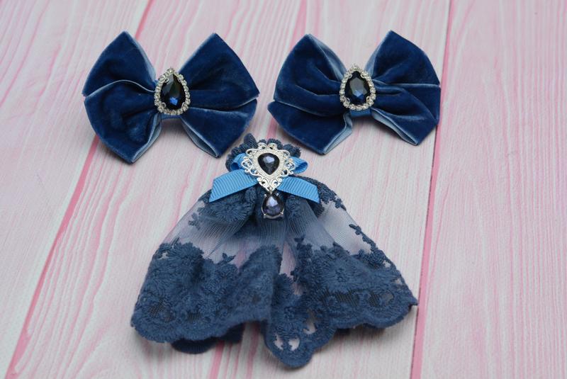 Набор состоит из бантиков и галстука. Выполнен в темно-синем цвете. Бантики из бархата, основание - резинки. Размер бантиков 9*6 см. Галстук-жабо - 11*11 см. Подойдет как первокласснице, так и старшекласснице.