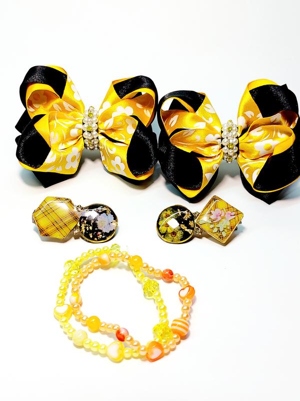 Набір складається з двох бантиків на ризниці 9 см , двох заколок 4,5 см та двох браслетів на ризниці. Заколки ручної роботи з ювелірної смоли та живих квітів. Можно упоковати в подарункову коробку.