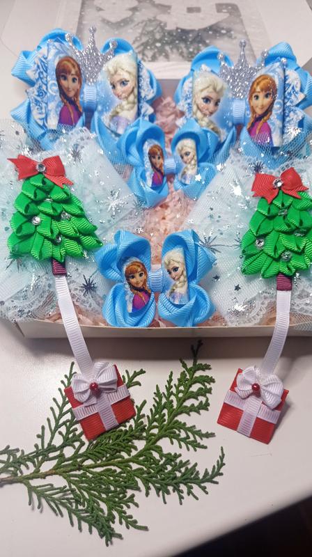 Набір з Ельзою та Анною.Виконані з репсової стрічки та кож замінника.Кріплення резиночки.Розиір бантиків з принцесами 8,5 см та 6 см,ялинка 10 см.Можемо зібрати набір на ваш смак, дивіться інші мої оголошення.