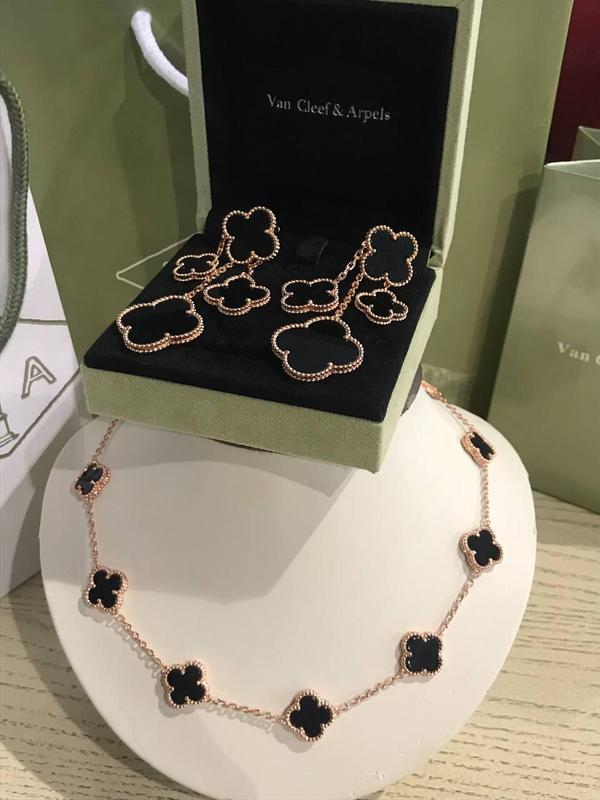 Набор vancleef/ ванклиф черный в позолоте :подвеска 10 клеверов, серьги "4 клевера" в розо...