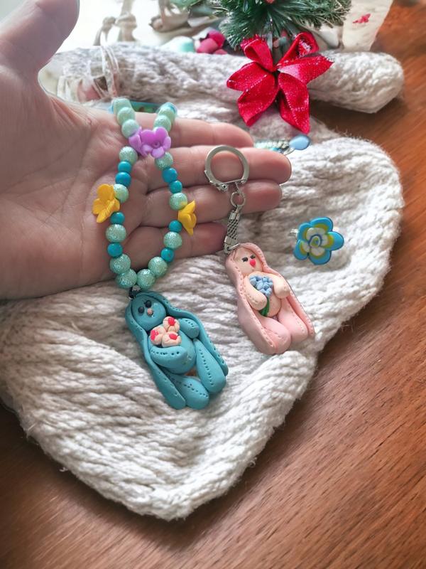 Ніжний комплект для дівчинки буси з блакитним зайчиком Тільда, брелок із рожевим Зайцем і маленькою брошкою. Зайчики виліплені з полімерної бельгійської глини. Авторська ручна робота. Намисто з подовжувачем.