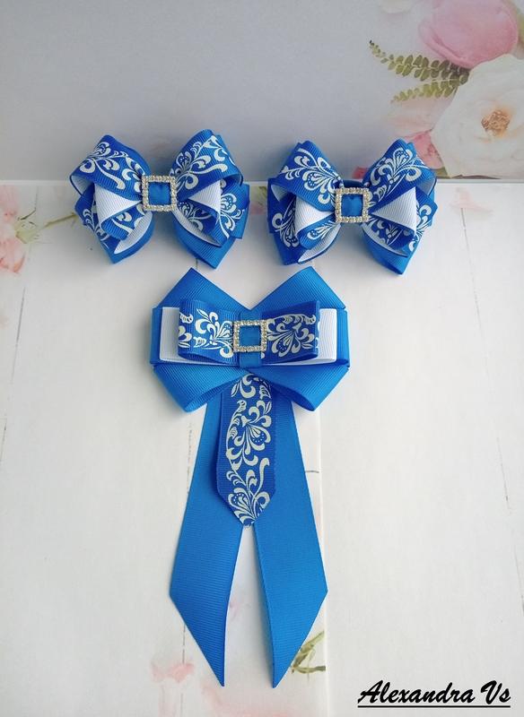 Набір складається з пари бантикв і краватки-брошки. Довжина бантиків 8 см, закріплені на резинки чудової якості. Довдина краватки 19 см. В наявності. Ціна вказана за набір.