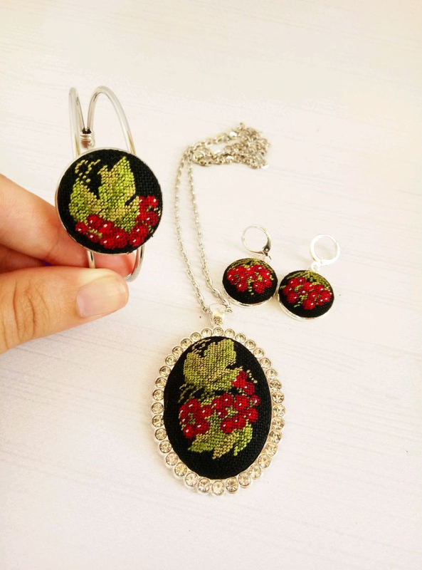 Кулон, браслет та серкжки "Калина". Вишито на чорному льоні. Ручна робота!