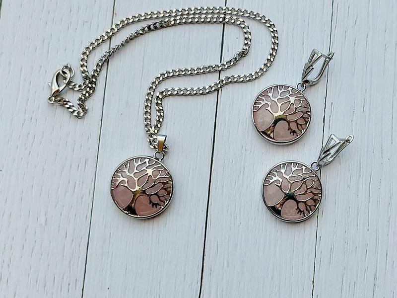 Матеріали: Швензи з гипоаллергенним покриттям (англ.замок), 18х12х6 мм., кулони підвіски "дерево" з натуральним каміння Рожевий Кварц, 30 мм. Ланцюжок - довжина 42 см. (за бажанням можна збільшити/зменшити, додати ланцюжок-подовжувач). Довжина сережок - 5 см. Додаткові характеристики: Комплектація: Кулон і сережки За бажанням можна змінити ланцюжок і довжину (якщо необхідний матеріал буде в наявності)