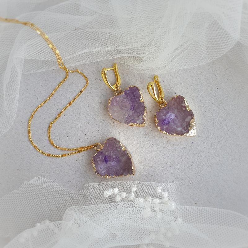 Підвіска і сережки у формі сердечка, лавандова підвіска та кульчики, прикраса на шию
