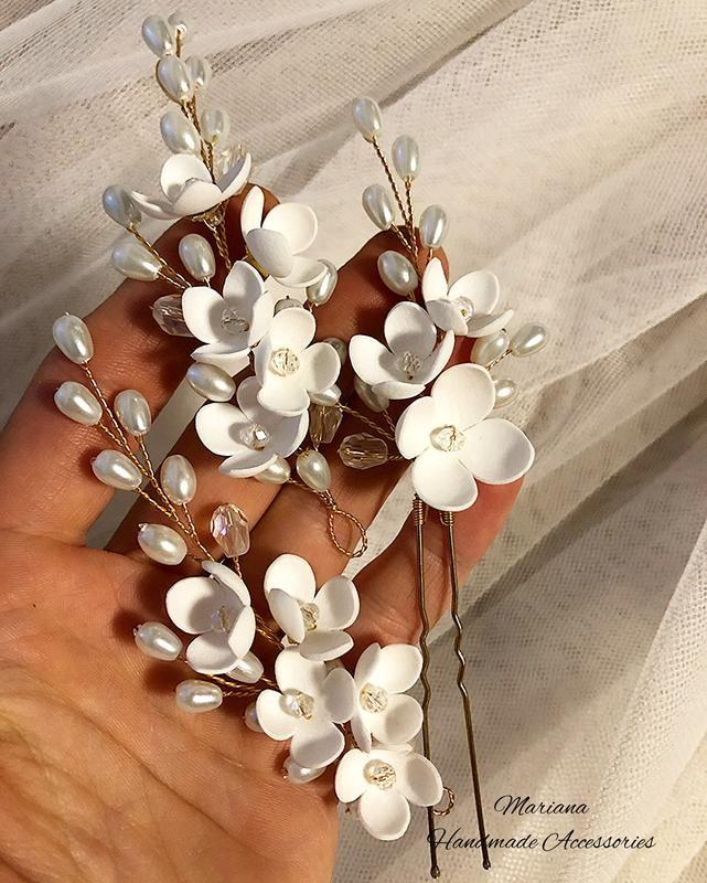 Прикраси сплетені золотистим дротиком з білих перлинок і білих квіточок з фоамірану Ціна вказана за набір. Довжина 1,гілочки приблизно 8-9 см.