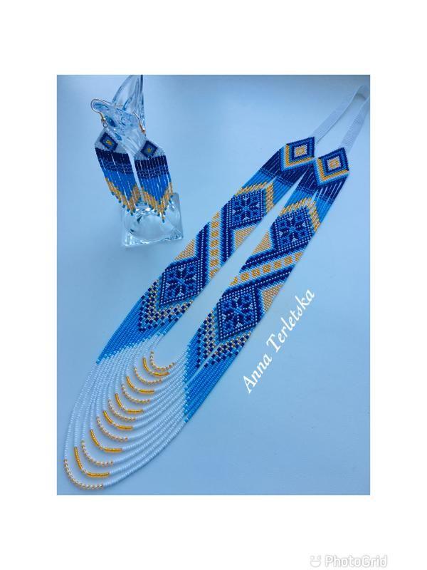 Набір виготовлений з чеського бісеру на міцній нитці. Довжина гердана складеного навпіл 50см, ширина полосок 4см. Довжина кульчиків 10см. Додаткові характеристики: Комплектація: Кольє і сережки Матеріал: Бісер Товар виготовляється на замовлення