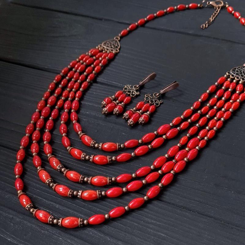 Комплект прикрас: класичне пятирядне намисто з натуральних коралів та сережки. Стильне невеличке намисто та сережки, де немає нічого зайвого. Довжина намиста узгоджується при оформленні покупки. Вартість вказана з урахуванням базової довжини намиста як на фото, по обхвату шиї 47 см плюс 5 см подовжуючий ланцюжок. Кожний наступний ряд +3 см. Якщо вам потрібна інша довжина - вартість буде перерахована відповідно до потрібної довжини. Також можу зробити браслет у комплект, на 2-3-5 рядків. Додаткові характеристики: Комплектація: Кольє і сережки