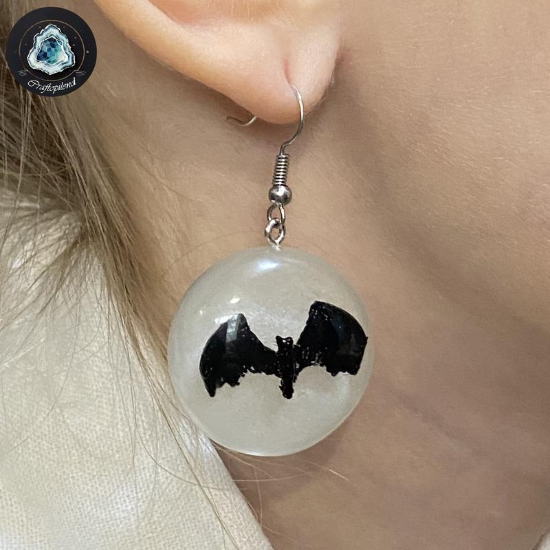 Ексклюзивний комплект прикрас з кажаном 🦇 – кулон і сережки з епоксидної смоли, що світяться у темряві м’яким блакитним сяйвом! Ці прикраси створені вручну, тож кожен виріб унікальний. Матеріали: епоксидна смола, шкіряний шнурок із застібкою “Лобстер”, металеві замки-петлі. **Розміри:** – Кулон: діаметр 35 мм, товщина 8 мм, вага 8,5 г, довжина шнурка – 60+5 см. – Сережки: діаметр 29 мм, товщина 7 мм, вага однієї сережки – 5 г. У комплекті – стильна подарункова коробочка з тематичним декором. **Переваги для вас:** Світіння у темряві створює магічний ефект; Ідеальний подарунок для шанувальників містики, готичного чи креативного стилю; Легкі та зручні у носінні; Унікальний дизайн, зроблений вручну з любов’ю. Такий набір підкреслить вашу індивідуальність і стане справжньою окрасою образу. Замовляйте вже сьогодні та додайте трохи магії у свій стиль!