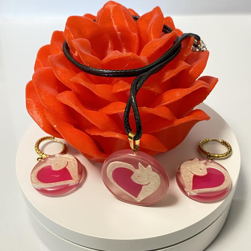 Цей унікальний набір (кулон + сережки) виготовлений вручну з епоксидної смоли та стане яскравим акцентом у вашому образі. Котик утворює сердечко — символ ніжності, любові та гармонії. Особливість: кулон і сережки мають ефект люмінофору — вони накопичують світло та випромінюють у темряві м’яке рожеве сяйво, створюючи чарівну атмосферу. Подарункова коробочка у вигляді квітки троянди входить у комплект — готовий варіант подарунка для коханої людини чи для себе. Розміри: Кулон: діаметр 34 мм, товщина 6 мм, вага 7 г, довжина шкіряного шнурка — 60+5 см. Сережки: діаметр 29 мм, товщина 7 мм, вага однієї — 5 г. Матеріали: епоксидна смола, шкіряний шнурок із застібкою “Лобстер”, металеві швензи-кільця. Чому варто обрати цей набір? Авторська ручна робота Світіння у темряві — романтичний та магічний ефект Легкі та зручні у носінні Ексклюзивна подарункова упаковка Порадуйте себе чи близьких стильним аксесуаром, який підкреслить вашу індивідуальність! Замовляйте прямо зараз, кількість обмежена!