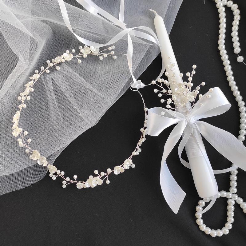 до набору входить віночок і свічка. віночок має довжину 43-44см, зроленл з перли скло та акрилових квітів .дріт не тьмяніє . зроблю під замовлення