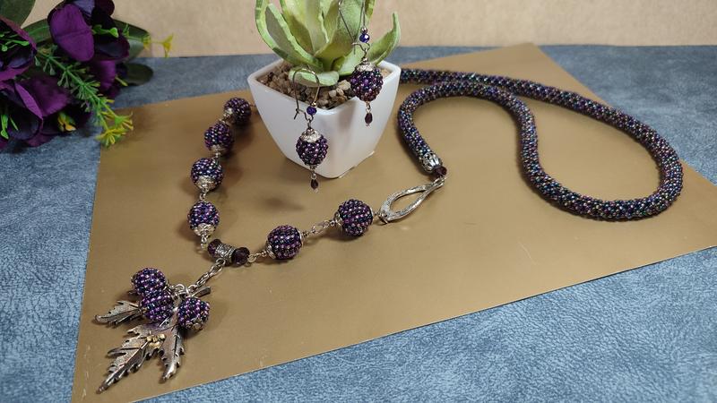 набір-кооьє "Сотуар" та сережки. довжина кольє 90см, підвіска 7см, сережки 5см. фурнітура срібло. кольє зібране на ювелірний трос оплетений бисером. підвіска зъємна можна кольє змінювати по формі.