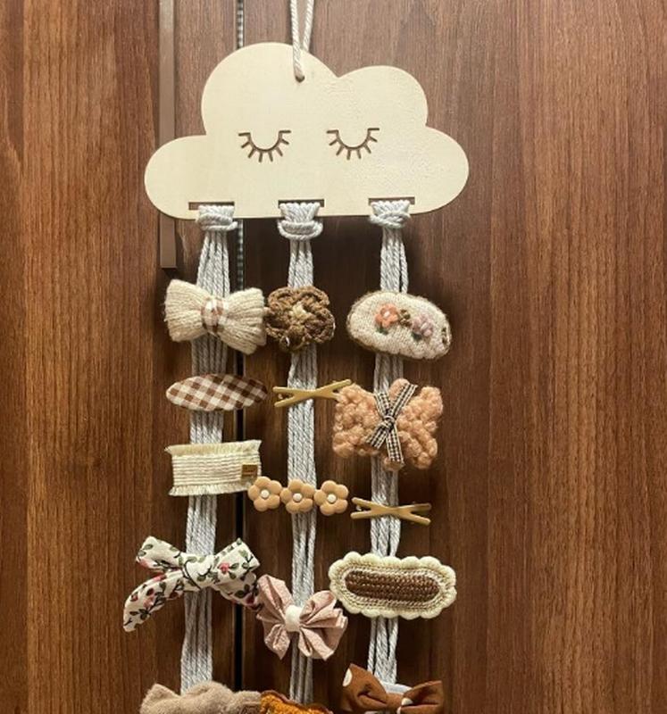 Органайзер для резинок і заколок. Органайзер для бантиків Хмаринка Домашній настінний декор дерев'яна підставка для зберігання шпильок та прикрас для волосся підвісний органайзер Ваші резиночки та шпильки постійно десь губляться? Органайзер для резинок та шпильок - відмінний варіант, який сподобається кожній маленькій принцесі, ваші резиночки завжди будуть на місці, і ще такий органайзер добре прикрасить вашу кімнату. - Розмір: довжина бавовняної нитки - 70 см, дерев'яна пластина 18x10,5 см - Колір як на зображенні - УВАГА! ПОСТАВЛЯЄТЬСЯ В РОЗІБРАНОМУ ВИДІ БЕЗ ПРИКРАС!