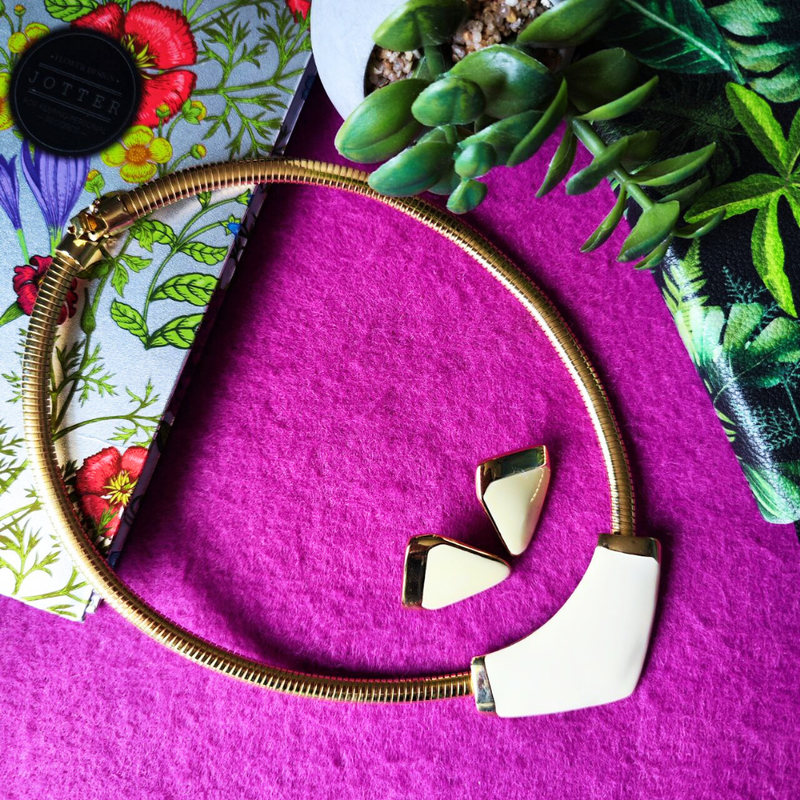 Гарний гарнітур америкнаського бренду PARK LANE, 80-90-і роки. Капітально виконані прикраси на основі золотистого сплаву та молочно-кремової емалі. Кольє-чокер, з плетінням омега та клиновидним центральним елементом. Застібка складна, фірмова промаркована бірка. Сережки пусети. Без маркування. Стан прикрас чудовий. Довжина кольє - 45 см. Розмір сережок - 2,2 х 2,8 см. Гарнітур у "рідній" коробочці. Доданий відеоогляд.