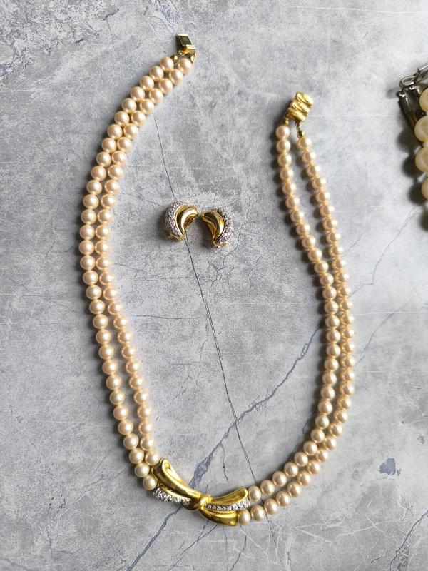 Набор Chartage, колье и клипсы. Натуральные жемчуг и позолота. Колье долго хранилось в неблагоприятных условиях, поэтому коробка испортилась. Сами колье и клипсы в отличном состоянии.