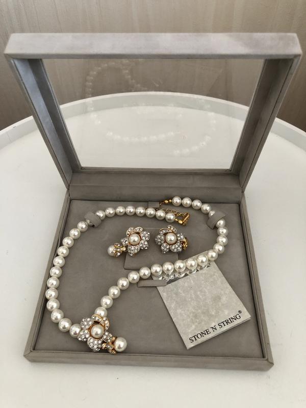 Набір прикрас, імітація перлин, сережки та кольє в коробці. Довжина кольє 41 см