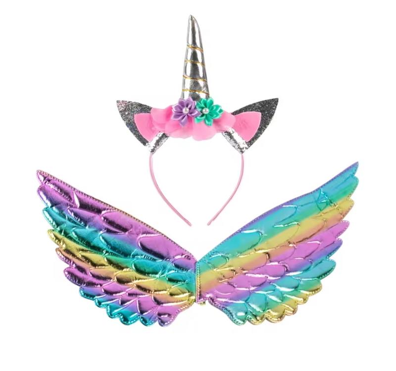 Яркий и красивый набор для праздника.Набор состоит из яркого ободка с рогом Единорога и блестящих крыльев феи. Ярко и оригинально.Кольора на фото.