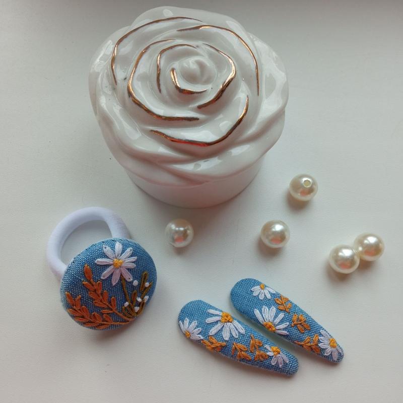 Набір з двох заколочок та резинки чудово доповнить літній образ! Ручна робота. Натуральний льон. Ручна вишивка. Ціна 300 грн.