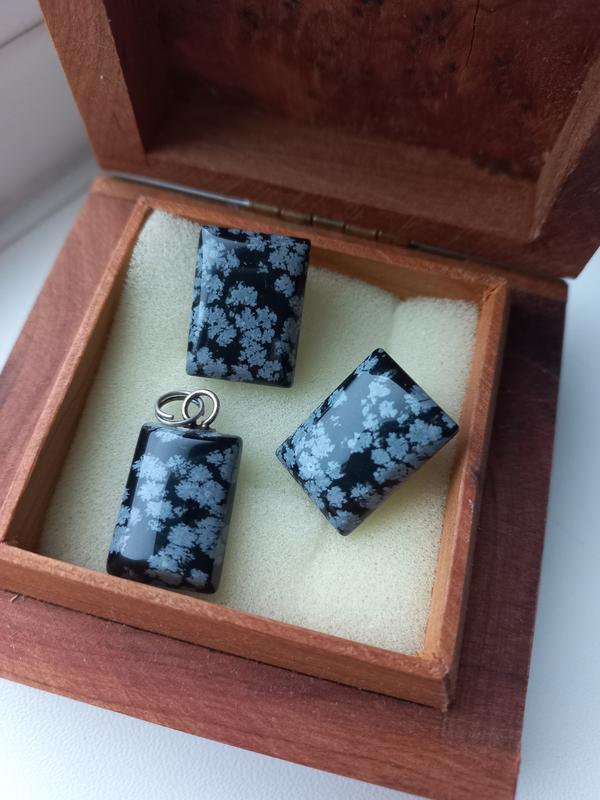 Вінтажний комплект- маленькі акуратні кліпси та підвіска зі сніжного обсидіану. Дуже красивий малюнок на камені. Розмір каменю 1.9 х 1.4 см. Дрвжина підвіски з вушком 2.7 см. З домашньої колекції.