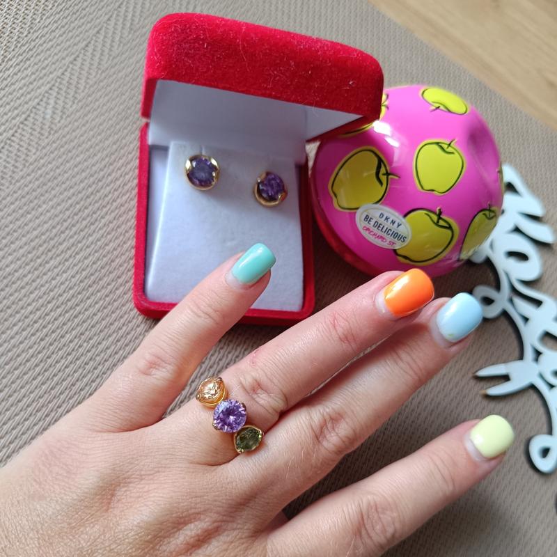 Шикарний набір з медичного золота і натуральним камінням аметистом, цитрином и хризолітом