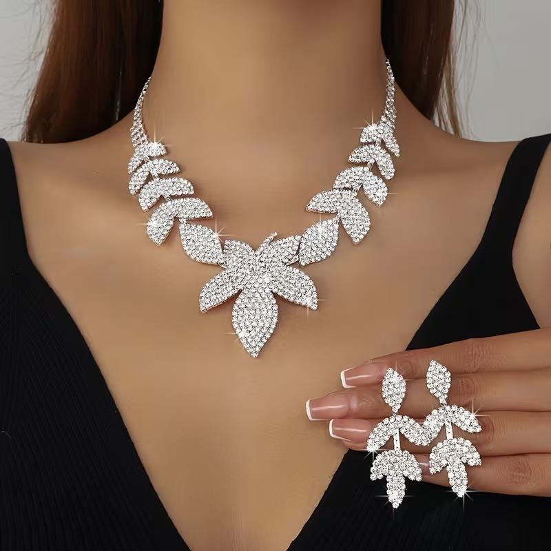Роскошный набор с камнями и кленовыми листьями - ожерелье и серьги