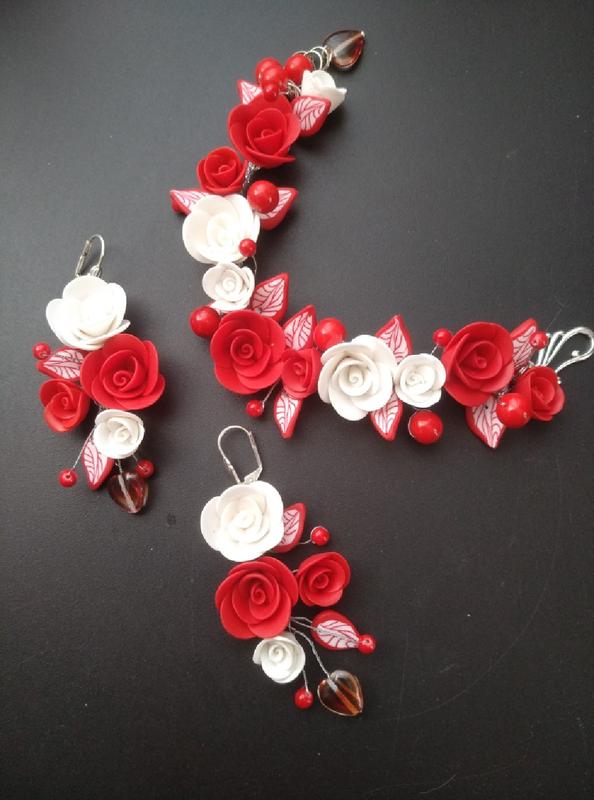 Браслет та сережки з червоними та білими трояндами з полімерної глини для жінок.