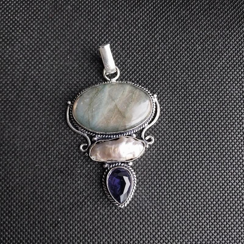 Предлагаем Вам купить яркий кулон из натурального камня лабрадор жемчуг и аметист в серебре. Длина кулона с петелькой 63 мм. Размер камня лабрадор: 34*22 мм., жемчуг: 23*9 мм, аметист 13*11 мм. Металл: индийское серебро, покрытое высокопробным 925 пр. Индийское серебро (сплав серебра, меди и латуни, покрытое серебром 925пр.) На изделии штамп 925