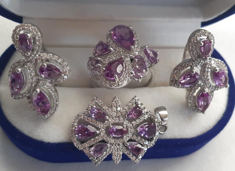 Комплект срібний фіолетовий турмалін із фіанітами. Матеріал — срібло 925 проби. До комплекту входить кільце 18 розмір, сережки, підвіс, довжина 28 мм. Загальна вага — 19,4 грама.