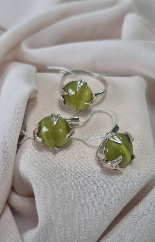 Срібний комплект з улекситом оливкового кольору та вставками золота.