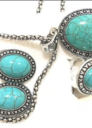 Набір Бірюза, сережки, підвіски на ланцюжку, кільце безрозмірне