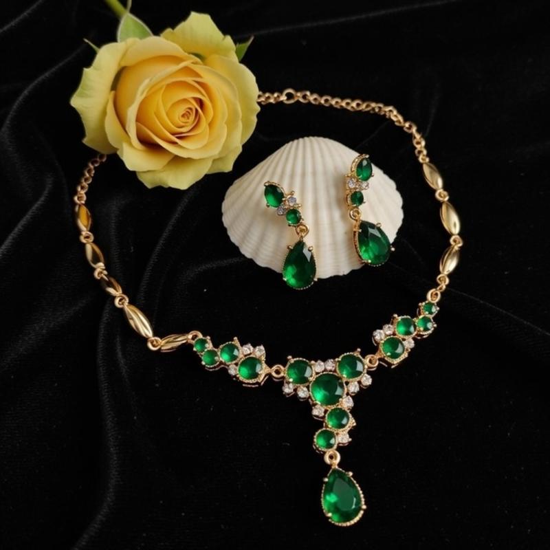 Розкіш, що зачаровує з першого погляду… Ефектний гарнітур із сережок та кольє — справжня прикраса для особливих моментів. Вишукане поєднання жовтого металу та глибокого зеленого каміння створює враження коштовностей, ніби смарагди в золотій оправі. Кольє витончен о лягає по лінії декольте, переливаючись насиченими відтінками зеленого. Центральна підвіска-крапля додає образу благородства й акцентує жіночність. Сережки елегантно доповнюють композицію — рухливі підвіси красиво виблискують при кожному русі. Камінь — зелене скло з глибоким блиском, що майстерно імітує смарагд. Жовтий метал підкреслює теплоту відтінку та додає виробу святковості. Ідеальний варіант для вечірнього виходу, урочистостей, фотосесій або коли хочеться виглядати розкішно без зайвих слів 💫 Цей гарнітур — про впевненість, жіночність і магію зеленого сяйва.